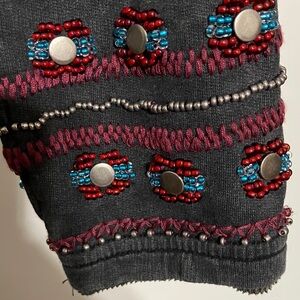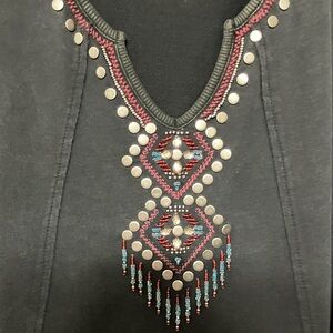 Washed and faded style cotton material in dark gray/black dress from Double D Ranch. Versatile and stylish. Size 2x. Pre owned. Beaded v-neck and beaded sleeve cuffs. Raw hem on bottom and sleeves. Sweatshirt material made to look washed and faded.