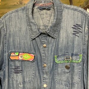 Chic light blue long sleeve denim shirt. Features snap up design and classic collar. Embroidery on front pockets. Size xl. Roll up snap sleeves. Pre owned. I love this shirt but it’s just too small for me.