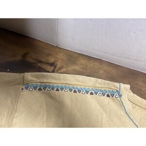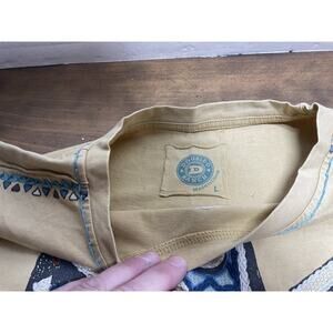 The Double D Ranch Shirt is a women's large Southwest Eagle embroidered t-shirt made of 100% cotton jersey fabric. This casual short sleeve shirt features a round neck and a solid yellow color with an embroidered eagle design, fitting a regular size type. Perfect for all seasons, the shirt embodies a Western, Southwest, Aztec, Cross, and Bohemian style, making it a versatile and stylish addition to any wardrobe.pre owned good condition we ship fast measurements are in the pictures