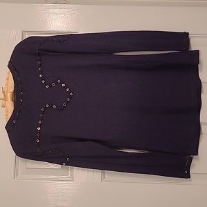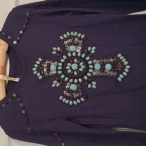 100% purple top featuring a cross made from aqua stone-like and pewter beads. The yoke and wrists are also outlined with pewter beads. One bead is missing from the right cuff. Good condition.