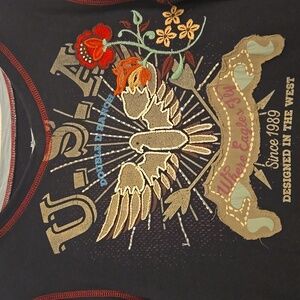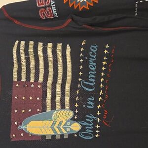 100% long-sleeved cotton top. The front features "U.S.A." and an eagle outlined in beads. Also has embroidered flowers. Right sleeve has embroidered "25th Anniversary" and left sleeve says "Home Sweet Home." Back features American flag. Buttons at cuffs. Good condition.