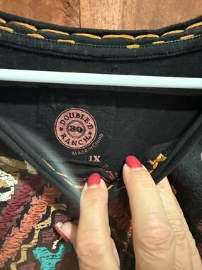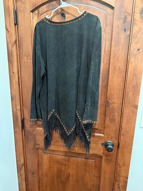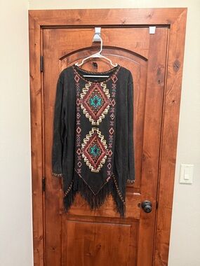 Double D Ranch long black top with beautiful earth tone stitching and design. Excellent condition. Worn or tried on one time. It’s stunning!! Would be beautiful with leggings and tall boots.