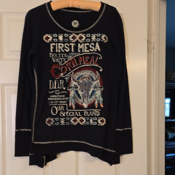 100% cotton tunic with embroidery and beading on the front, white stitching along the neckline, hem, sides and sleeves. Fit is loose.