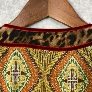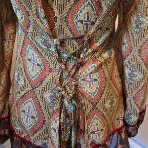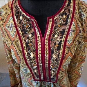 Vibrant tunic with intricate patterns. Features a mix of yellow, red, and black colors. Perfect for a stylish, casual look.