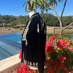 This rare find is so elegant and beautiful! Vintage DD Ranch Silk Velvet Jacket with cream embroidery on front, back and sides. A beautiful heart pattern is so eye catching! Perfect with leggings or skirt! Tagged a size small. Bust is approx. 38" with a length of 24" and sleeve length from shoulder seam to cuff 24". Snap closure and partially lined.