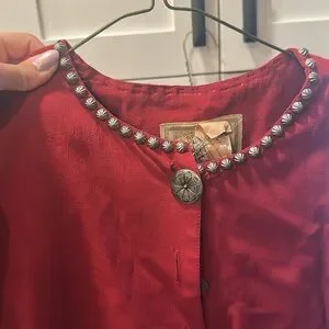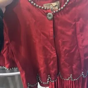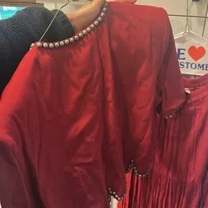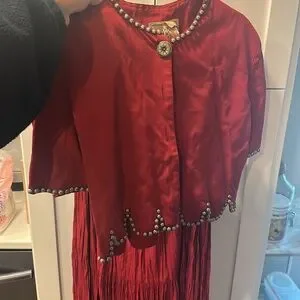 Double D Ranch Wear Matching Set, worn to a wedding once. Elastic is almost gone in the skirt- vintage. Top is a small and the bottoms are a medium. Studded, shoulder pads
