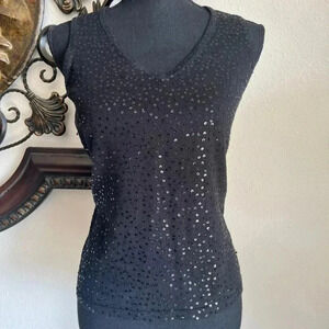Double D Ranch, black, linen/cotton blend sweater tank top with sequins and beads sewn on by hand. (A few sequins may be loose here and there) No holes or stains. Ready to wear! Great for wearing under a blazer! Size: XS