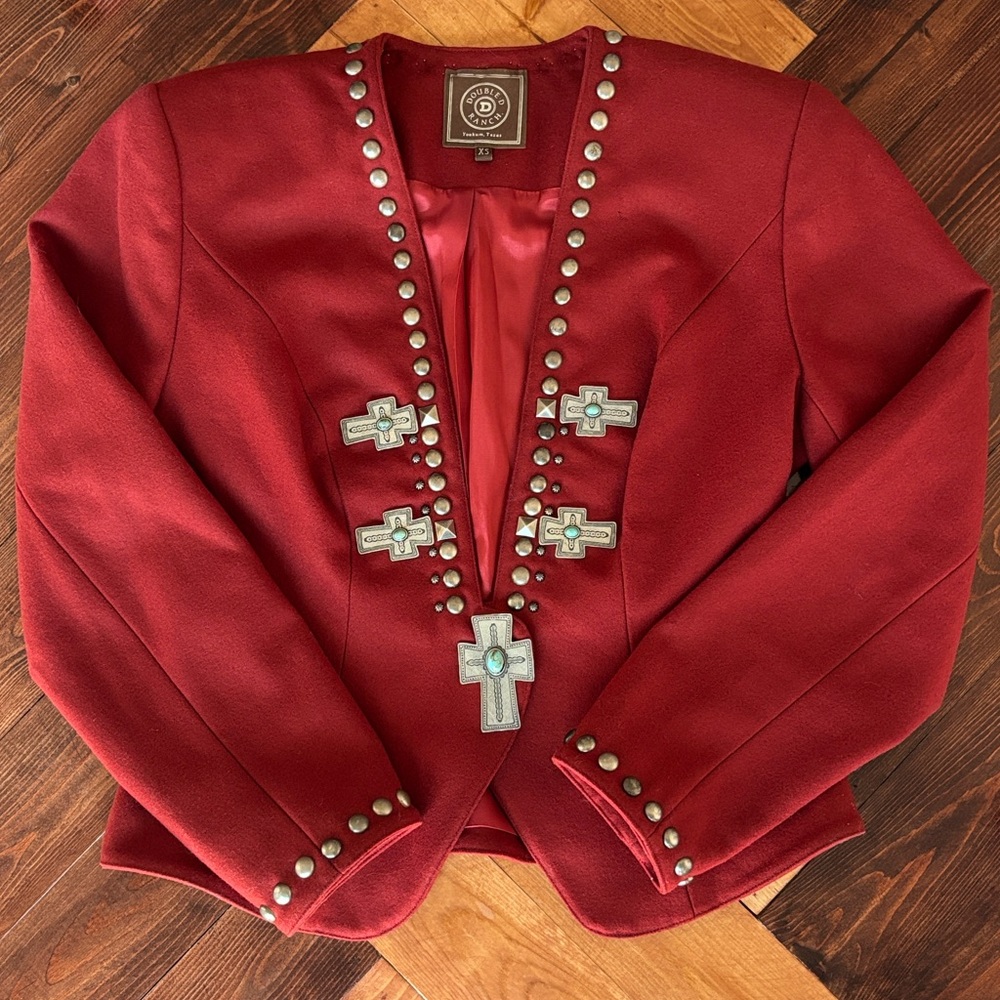 This distinctive jacket features a wool blend fabric, silvertone crosses with turquoise cabochons, and stud detailing around the neckline and cuffs. There are slight signs of wear which are pictured but hardly noticeable unless inspecting up close. A beautiful piece to add to your closet!