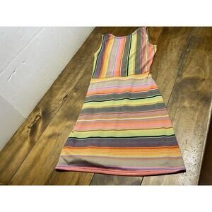 The Double D Ranch Wrap Dress in a medium size features a serape western style with a striped pattern in multicolor. This sleeveless dress has a v-neckline and a tie closure, perfect for a casual occasion or a bohemian-themed event. Made from a blend of polyester and spandex, the knee-length dress fits comfortably and has a flattering wrap design. Representing a blend of western, festival, and bohemian themes, this versatile dress is ideal for the summer, fall, and spring seasons, making it a stylish addition to any woman's wardrobe.pre owned good condition we ship fast measurements are in the pictures