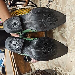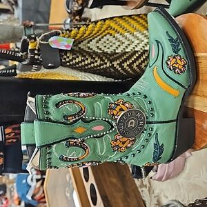 So rock me mama, like a wagon wheel! We are saying yes and please to this fun new design from Double D Ranch! Made by Old Gringo Boots, you're looking at beautiful turquoise leather, accented with fun floral embroidery, wagon wheel and horseshoe patterns, and studded details -- all against a darling ankle height silhouette. These cute cowgirl boots will have you singing -- "Heyyyyy, Mama Rock