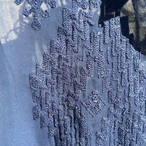 Beautiful DDR button down blouse with tone on tone embroidery on the super sheer classic navy (oil spill) top with silver tones buttons. Just beautiful