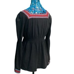 Double D Ranch embroidered jersey long sleeve top. Black jersey with turquoise blue, red, and yellow floral bird embroidery. Accented with rhinestones. Square neck. Flared long sleeves. Elastic smocked waistline.