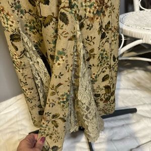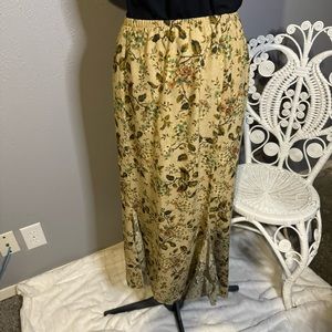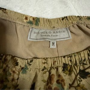 Double D Ranch tan floral skirt with lace insets at hem. Elastic waist.