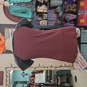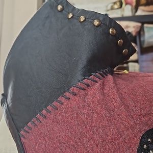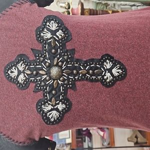 Double D Ranch burgundy top with studded leather sleeve and embellished cross in front. EUC. Size small.