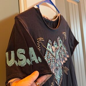 This Double D Ranch black top is in good used condition, has brads and beautiful appliqué.