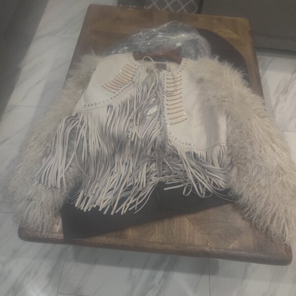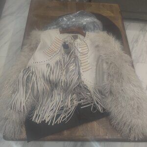The luxe look-at-me jacket is crafted in supple sheepskin with Mongolian lamb fur sleeves. The silhouette is an open-front crop that ties at the neck, complete with 360 degrees of full-length fringe, and finished with eye-catching details of hairpipe and some rhinestone trim that’s sure to sparkle