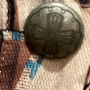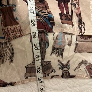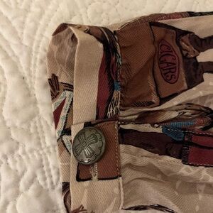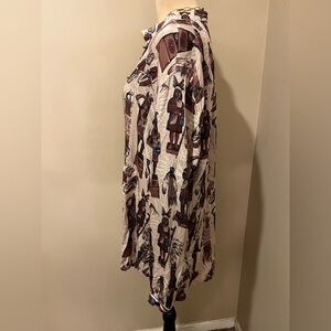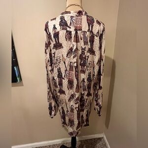 The imagery on this print is reminiscent of the antique carved wooden statues that stood outside cigar shops, dating back as far as the 17th century, to indicate that tobacco was sold inside. Our first iteration of the image was early on in Double D Ranch history, appearing in the fall 1992 collection, and when it came time to reimagine significant pieces for our 30th anniversary, the Tobacco Salesman was on that list. It is a more visually dimensional print for our Cody collection. We imagined the print into this relaxed fit, almost tunic-style blouse with a short standup collar and conch button placket. It's a flattering, easy-to-wear silhouette that's a perfect match for a classic pair of jeans or even leggings and boots.