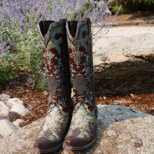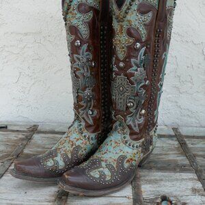 The Double D Ranch Ammunition DDL001-1 is a piece of art! A southwest influence inspires the look of this heavily adorned western boot. Silver studs and crosses are perfectly paired with a turquoise leather string that acts like a corset. The Ammunition can be worn with dresses and skinny jeans. Makes an exceptional bridal boot!
