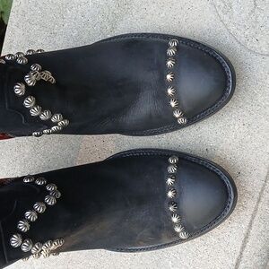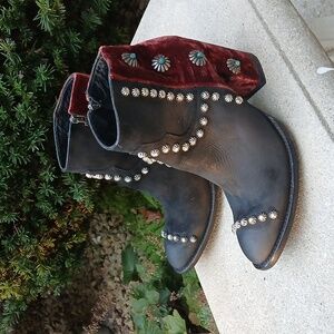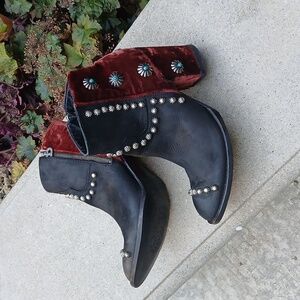 Double D by Old Gringo Tahoma Black Wine Sz 9. The Tahoma by Old Gringo for Double D Ranch is as sweet as Red VELVET Cake! No really, the back of these boots feature gorgeous velvet in the most beautiful wine red hue. Separated by a chic zipper, the front half of the Tahoma boot dons sleek black leather accented with silver stud work. Oh, and you will love the medallions featuring a pop of turquoise that run down the sides of the shaft. With a chunky high heel and comfortable round toe, you'll be both stylish and comfortable in this Double D Ranch creation. Admit it, you're getting a sweet tooth for the Old Gringo Tahoma Boots, so satisfy the craving! Elegant ankle boots with studded details. Velvet red heel adds a unique touch. Perfect for any occasion.