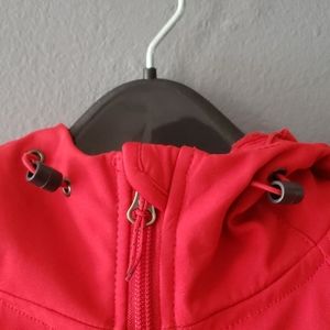 Red scuba hood soft shell jacket from Double Diamond. Good used condition. The color is slightly darker than shows in the photos. The jacket has a soft fuzzy inside, two side pockets, and one breast pocket. The hood and wrist size can be asjusted. Only damage is the piece on the zipper broke off, but the string is still there.