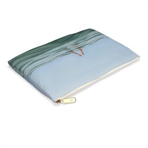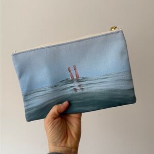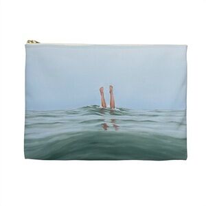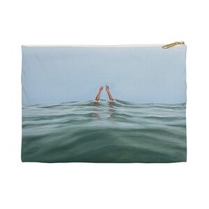 Carry a touch of coastal charm with the “Double Dipped” zippered pouch. This versatile pouch features the playful artwork of legs and arms emerging from serene blue-green waters, inspired by the original oil paintings. Perfect for storing cosmetics, stationery, or small essentials.