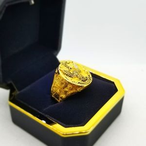 Stainless steel with 18k gold plate two eagles standing exactly in line with each other two heads are visable but only one body standing on a rod. Anoch symbols on each side standing for eternal life in Egyptian history. Generously plated with dark hues to standout and separate for dimentional purpose of clarity.substancial size and weight.