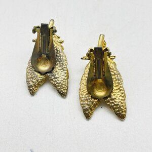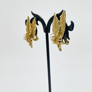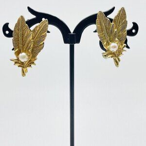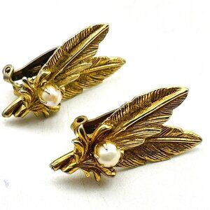 Double Feather Earrings Clip On Gold Tone Simulated Pearl Accent Leaves Nature