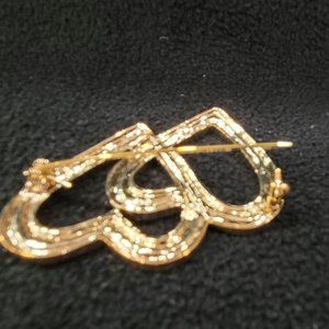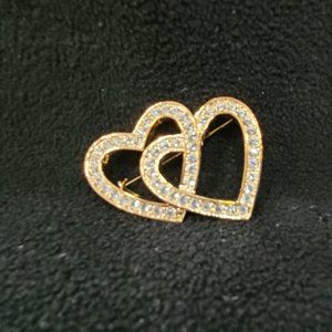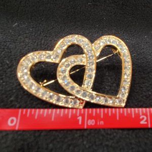 Vintage Double Heart Brooch. Gold with rhinestones inlayed in the hearts. Perfect for that special someone for any occasion. Measures approximately 1 3/4 inches. Great condition. Item D-3024