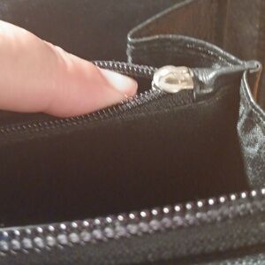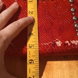 Stylish red snake print wallet with silver studs. Features a zipper closure and a decorative charm. Has some wear, inside has one zipper pull missing. Very well made.