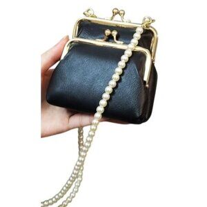Double Kisslock Pearl crossbody strap vegan leather Black handbag