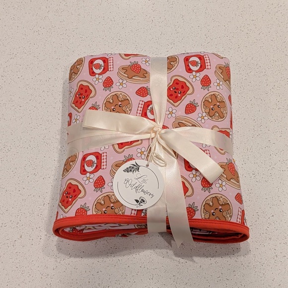 This sweet blanket is perfect for snuggling up for bed or those early mornings where your little one decided it was wake up time a little too soon! Our Strawberry Jams print is on the front and complimented with a matching solid coral back.