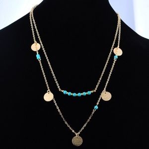 •Gold and turquoise beads on first layer, beads and circular charms on second