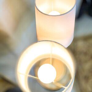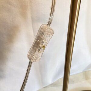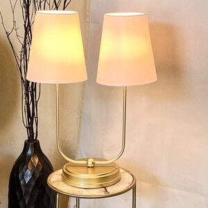 Double Light Task Table Lamp (2 AVAILABLE) features a unique U-shaped brushed gold body sitting atop a brushed gold color base. Each end of the U supports a small tall, white tapered shade. Control the two lights with a toggle switch integrated in to the clear colored cord. 22" high and 18" wide.