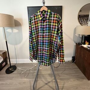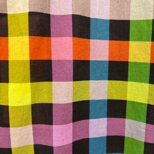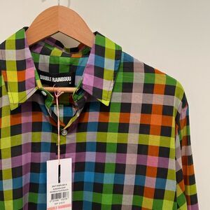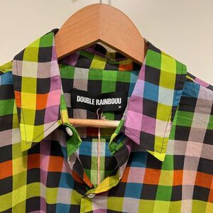 Vibrant checkered shirt by Double Rainbouu. Features a mix of green, purple, orange, and blue.