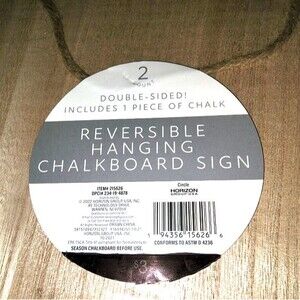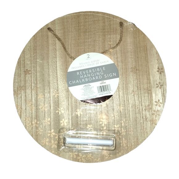 Double Sided Hanging Chalkboard Sign 11.5" DiameterX0.375" Thick. This circular sign is a faux wood grain with little shimmery flowers on the front and black chalkboard on the back. It hangs with about a 5" drop from a jute rope loop and includes one full stick of chalk. It's a generous size at 11.5" diameter and can be used for any number of things from keeping a grocery list to writing family notes. New in plastic.