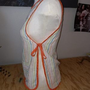 Double-sided Time Capsule kitchen work apron vintage 1970s looks handmade. Very hard item to find. I am an apron collector LOL. I love selling aprons from another time. This is made of a thin fabric that feels like linen. 26 in Long 20 in wide at the bottom straps that tie together on the side are 12 inches. Retro orange and green pink brown blue stripes on white fabric.