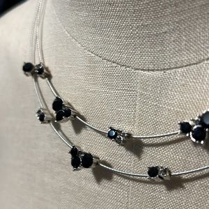 The double strand necklace has black and white rhinestones on a firm wire that holds its shape. Does not bend. Necklace falls at approximately 19”. Very lightweight. Only one pair in stock and ships out quickly.
