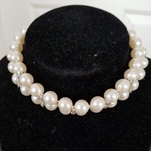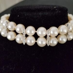Details: vintage faux double pearl choker with cubic zirconia spacers it has a hook and a pearl extension chain to hook it closed (the third picture shows the clasp)