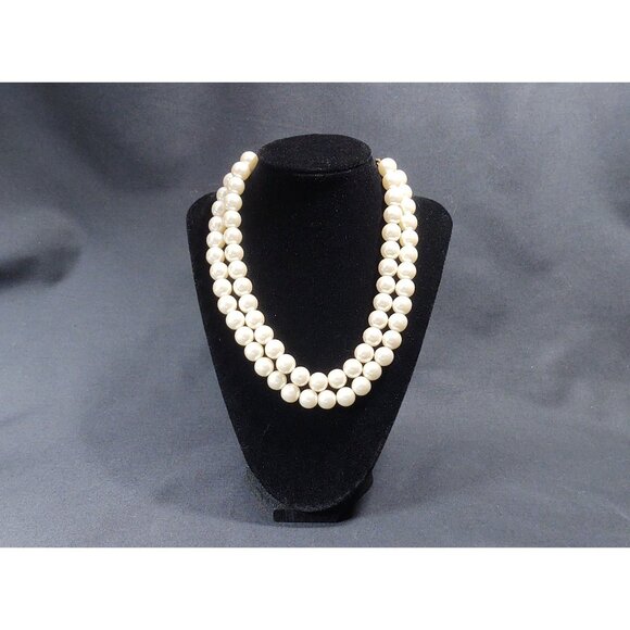 This is a high quality 17" long double strand faux pearl necklace that is comprised of beads with good and even luster, same sized/shaped beads and a gold tone clasp. This faux pearl necklace will make an wonderful addition to your jewelry box or will be a great Christmas gift!