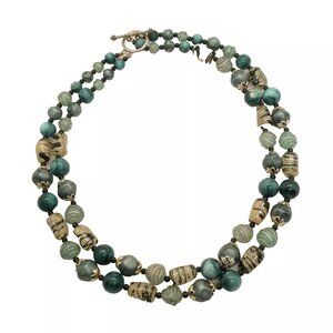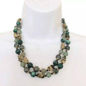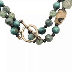 This stunning piece is 2 strands of gorgeous beads. The beads are a bluish green with some glass cream colored beads with black. Not all beads are glass. It is in beautiful condition. Including the clasp, it is 19" long.