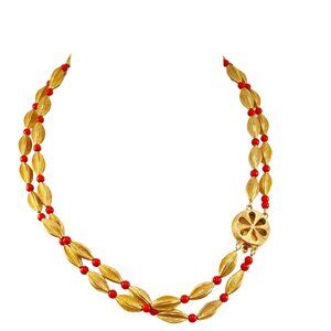 Unbranded Double Strand Vintage Choker Necklace bedecked with textured beads. The 16" necklace boasts a retro, 1960s style, featuring gold and red gold-plated metal.