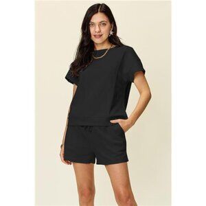 Double Take Full Size Texture Short Sleeve T-Shirt and Drawstring Shorts Set