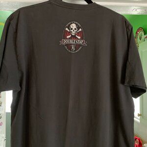 A double tap t-shirt at an XL and without rips or stains. "Anything worth shooting is worth shooting twice" is the logo.