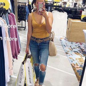 A plunging V-neck and back to match characterize a rib-knit tank with a slightly cropped hem. 66% polyester, 29% rayon, 5% spandex