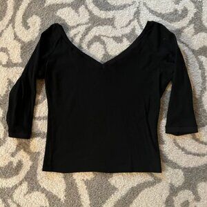 V Top - Size Small. V neck in back and front. 3/4 length sleeves. PRICE IS FIRM. Stretchy polyester spandex blend. Good condition. Vintage. Tags have been removed. Pit to pit is 18 inches. Length from top of shoulder is approximately 19 inches. All measurements are approximate. Bodycon. This is very flattering on.