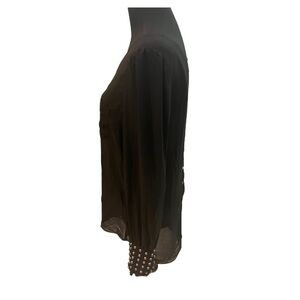 This Double Zero top is a versatile piece. The semi-sheer fabric, loose high-low fit, full button-back, and chrome applique cuff details create an effortlessly chic and comfortable vibe. The fabric is modest enough to feel covered, yet still stylish.