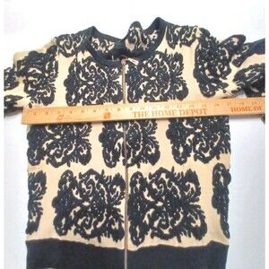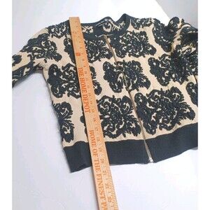 The Double Zero Embroidered Knit Zip-up Cardigan Sweater in Women's Size Small features a floral pattern in cream and black embroidered colors. Made of acrylic knit fabric, this sweater has long sleeves, a round neckline, and a full zip for easy wear. The Barbie character accented with embroidered details adds a touch of style to this designer piece, suitable for various occasions from party to casual or business settings. Hand wash only to maintain its quality. This classic cardigan with regular fit and stretch features is a must-have addition to any wardrobe.