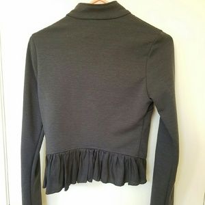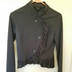This is a very pretty gray jacket with ruffles. It has buttons, and is extremely comfortable to wear for every day.