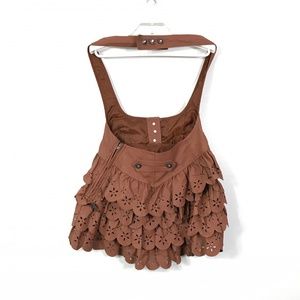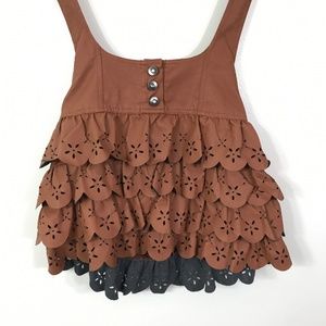 Item 15656 - Layered leather-look open-back halter top by Double Zero. Gently pre-loved condition with no stains, rips, holes, tears, etc. Adjustable closure at back of neck. See pictures for more details.