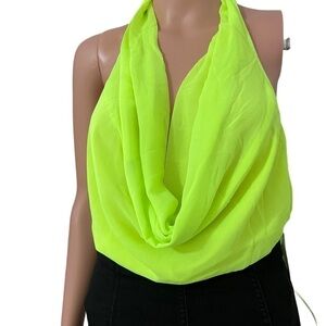Sexy, a tad sheer and perfect for this Summer. Go out on the Vegas strip in this lightweight top. New with tags. Clips on bottom and cascading at bust. Box- A